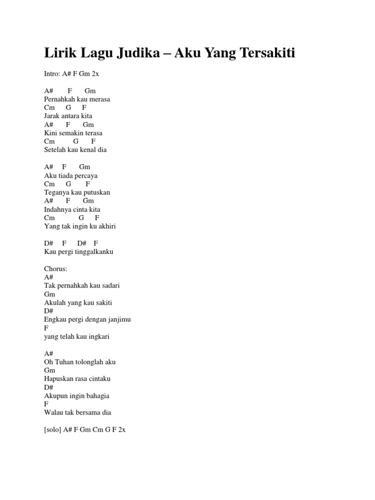 Berikut ini adalah lirik dan chord lagu Aku yang Tersakiti dari Judika dan Kotak. C G Am bukankah kamu juga merasa. Kunci Gitar Judika - Aku Yang Tersakiti.
