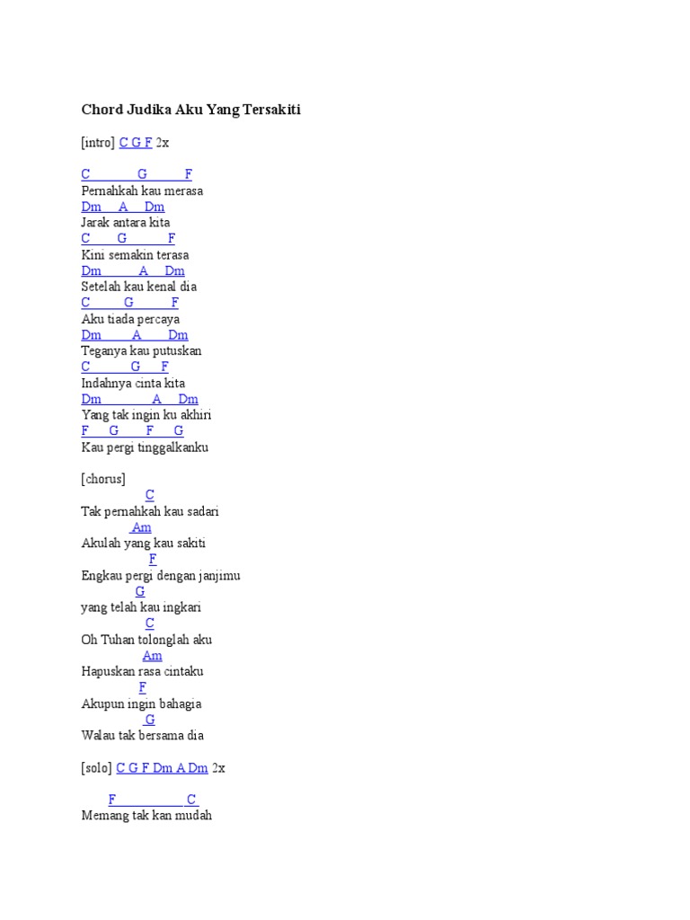 Chord Gitar Chord Gitar Aku Yang Tersakiti - Judika Lengkap dengan Lirik Lagunya Lagu berjudul Aku Yang Tersakiti yang dinyanyikan oleh Judika simak chord dan lirik. Capo di fret 3 Drum Intro Intro G D Em G D Em G D Em Pernahkah kau merasa. Dm A G dingin mulai menjalani percakapan kita.