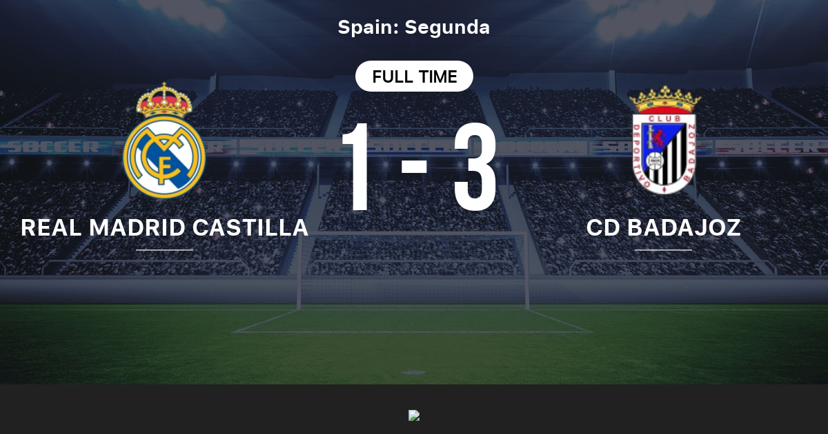 Real Madrid Castilla won 3 direct matchesCD Badajoz won 1 matches0 matches ended in a drawOn average in direct matches both teams scored a 350 goals per Match. Síguenos en nuestras redes socialesTwitter. Check preview and live results for game.